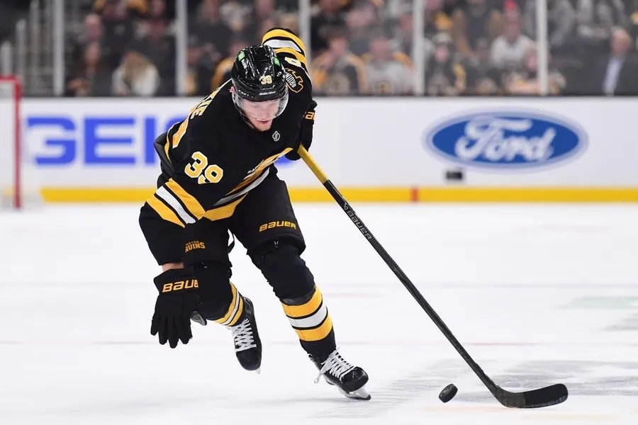 30 de outubro de 2025; Boston, Massachusetts, EUA; O central do Boston Bruins, Morgan Geekie (39), controla o disco durante o primeiro período contra o Buffalo Sabres no TD Backyard. Crédito obrigatório: Bob DeChiara-Imagn Photographs