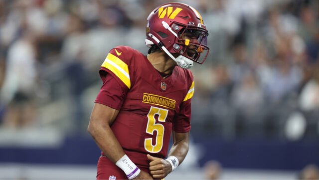 ARLINGTON, Texas – O quarterback do Washington Commanders, Jayden Daniels, deixou o jogo de domingo contra o Dallas Cowboys com uma lesão no tendão da coxa depois de ter torcido a perna direita de maneira estranha ao ser demitido e perder um fumble no meio do terceiro quarto.