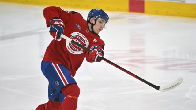 24 horas depois de assinar uma prorrogação do contrato de habitação e quem o relatou mais de 70 milhões de dólares, Lane Hutson foi nomeado o primeiro jogador do Canadá à saltitar sobre o glace do Centre Bell antes do treinamento matinal de mardi.