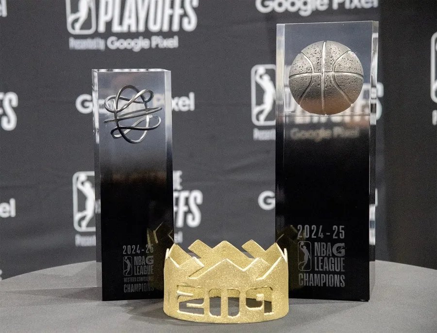 Os troféus da Conferência Oeste da NBA G League, à esquerda, e do Campeonato da G League estavam em exibição na Adventist Well being Enviornment para um evento de comemoração pela vitória dos Kings no Campeonato da NBA G League.