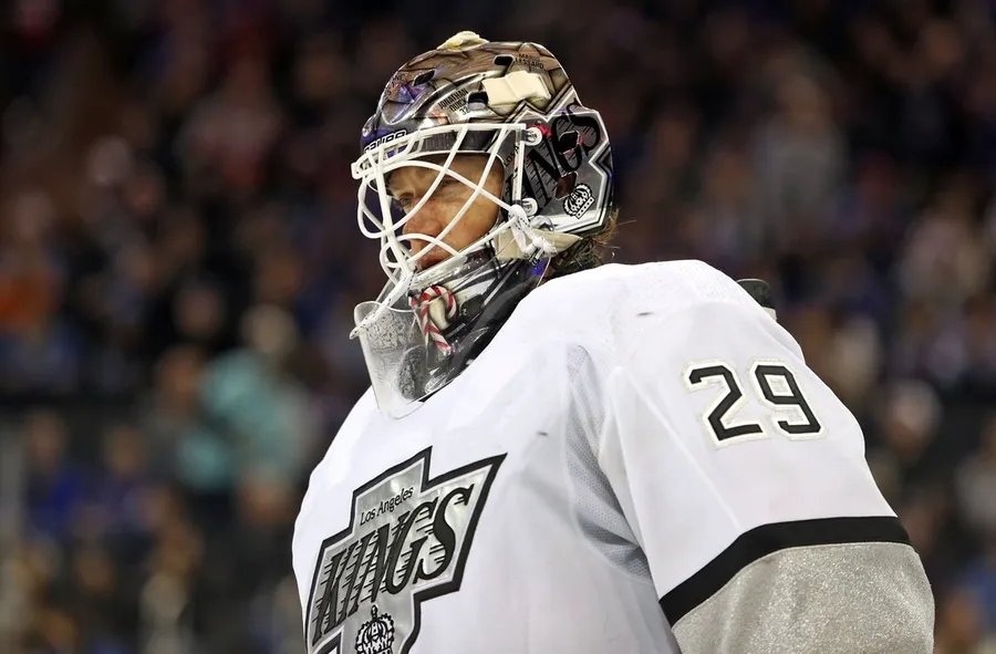 10 de dezembro de 2023; Nova Iorque, Nova Iorque, EUA; O goleiro do Los Angeles Kings, Pheonix Copley (29), patina até o banco durante o terceiro período contra o New York Rangers no Madison Sq. Backyard. Crédito obrigatório: Danny Wild-Imagn Pictures