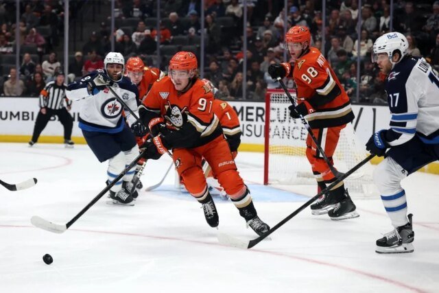 Leo Carlsson marcou dois gols para estender sua seqüência de pontos para 10 jogos e o Anaheim Geese derrotou o visitante Winnipeg Jets por 4 a 1 no domingo, pela sétima vitória consecutiva.