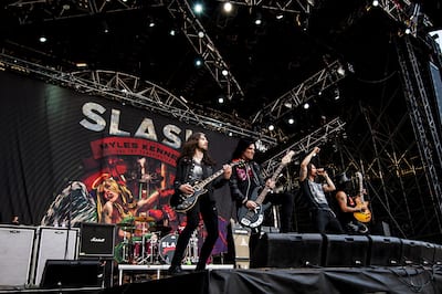 “O guitarrista Slash (Saul Hudson) se apresentando com sua banda, Myles Kennedy e The Conspirators (Myles Kennedy, Todd Kerns, Brent Fitz e Franck Sidoris), no palco do pageant Gods of Metallic na Area Fiera Milano Stay. Rho, Itália. 23 de junho de 2012 (Foto de Francesco PrandoniArchivio Francesco PrandoniMondadori através da Getty Photographs)”