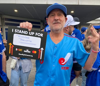 Parmi os partidários encontrados no exterior do Rogers Centre, Tony Giambattista, 60 anos e residente em Toronto, arborizou uma camisa azul poudre das Expos de Montreal com o número 8 e o nome de Gary Carter na parte traseira.