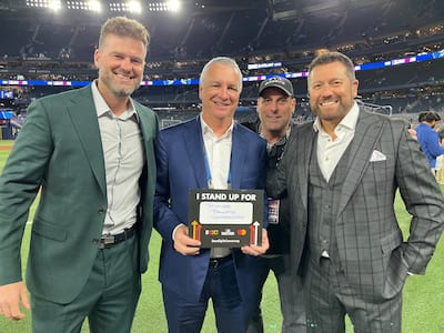 A equipe de difusão de partidas de beisebol da rede TVA Sports activities rendeu naturalmente uma homenagem a Rodger Brulotte. De gauche à droite, Karl Gélinas (analista), Denis Casavant (descritor), Marco Lamontagne (produtor) e Michel Godbout (repórter).