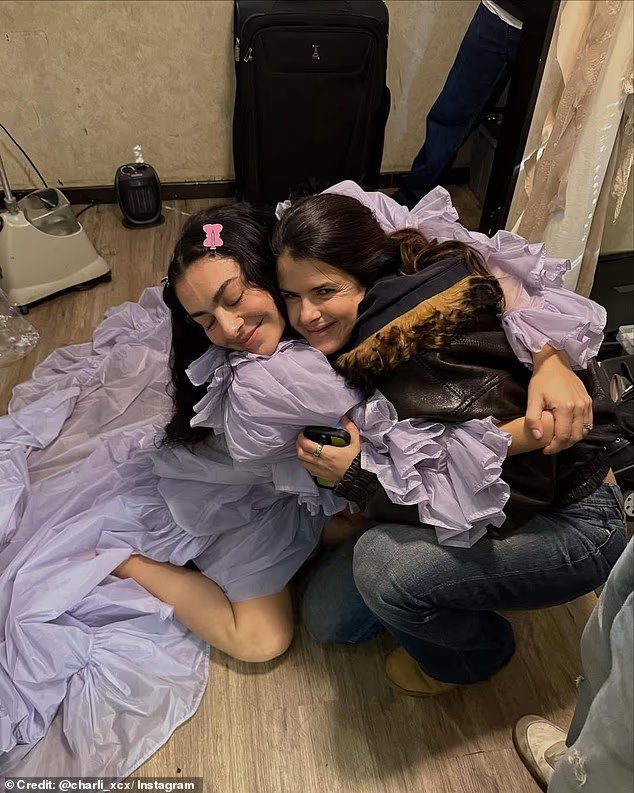 Charli é vista em um vestido lilás roxo estilo gótico para combinar com o tema da música e do filme, sentada no chão abraçando a diretora criativa Imogene Strauss.