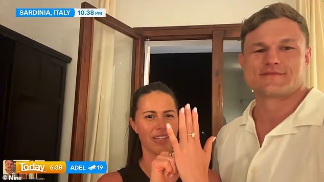 Aparecendo no Channel 9’s As we speak na manhã de segunda-feira, a apresentadora de esportes e seu noivo estavam radiantes enquanto ligavam da Itália