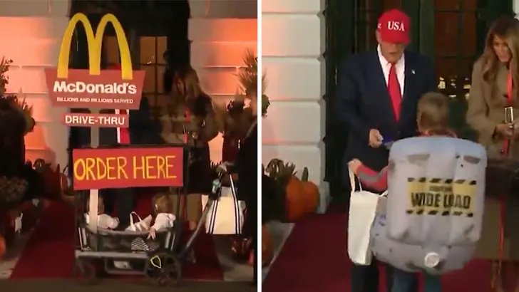 Trump estava claramente se divertindo distribuindo guloseimas… a certa altura, ele colocou de brincadeira uma barra de chocolate em cima de uma fantasia de criança e os mandou embora.
