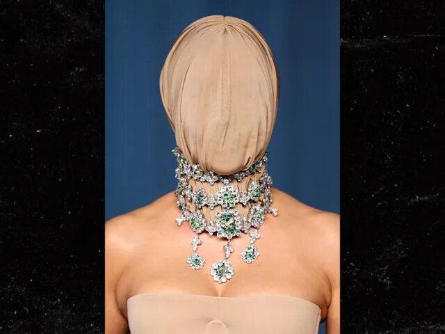 A magnata do SKIMS chegou ao tapete vermelho no sábado à noite com um vestido Maison Margiela – uma obra-prima sem alças, com espartilho, mangas drapeadas e uma máscara combinando que escondia completamente seu rosto e cabelo.