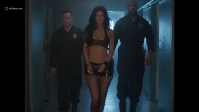 Na última promoção, a estrela dos Kardashians pode ser vista sendo escoltada através de uma prisão por dois homens vestidos de policiais algemados.