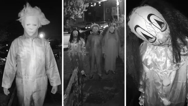 vídeo horrível da campainha TRIO MASCARADO DE Halloween aterroriza a família
