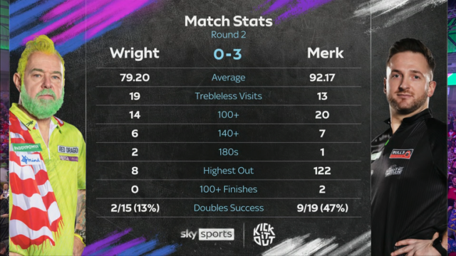 Wright, que fez sua marca registrada festiva, foi abalado por Merk, que acertou uma finalização fabulosa de 122 para vencer o set inicial em pernas retas com o escocês 0/4 em suas duplas e uma média baixa de 78,6.