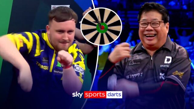 Luke Littler acerta 170 checkout contra Paul Lim no Bahrain Masters, com os dois homens pescando o peixe grande no palco! Crédito: PDC