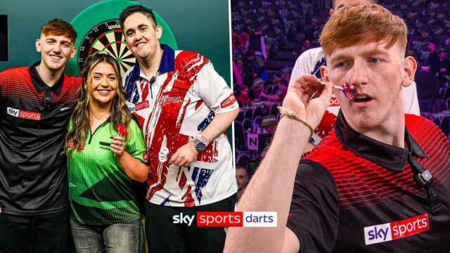 Ginge, PieFace e Bambino Becky enfrentam o desafio de 9 dardos no palco Alexandra Palace do Campeonato Mundial de Dardos