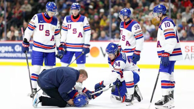 O pequeno irmão de Lane Hutson foi abençoado durante a partida contra a Suíça, o campeão do mundo júnior de hóquei. O atleta de 19 anos se destacou no gelo no segundo período e foi conduzido ao hospital.