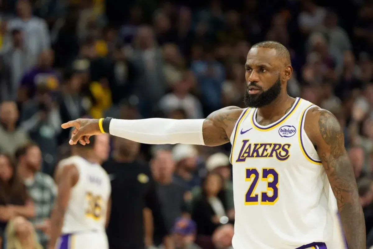 14 de dezembro de 2025; Phoenix, Arizona, EUA; O atacante do Los Angeles Lakers, LeBron James (23), reage após uma falta durante o segundo tempo de um jogo contra o Phoenix Suns no Mortgage Matchup Middle. Crédito obrigatório: Allan Henry-Imagn Pictures
