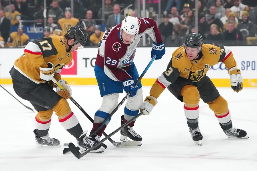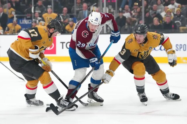 Nathan MacKinnon marcou seu 31º gol na liderança da liga com duas assistências e também marcou o gol da vitória na quarta rodada dos pênaltis, quando o Colorado Avalanche derrotou o Vegas Golden Knights por 6 a 5 na noite de sábado em Las Vegas.