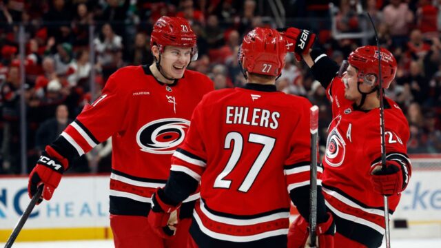 Ehlers, que assinou com o Carolina fora da temporada depois de jogar 10 anos no Winnipeg, também deu uma assistência. Taylor Corridor marcou dois gols e Mark Jankowski fez um gol e duas assistências. Alexander Nikishin e Andrei Svechnikov marcaram um gol e uma assistência e Eric Robinson também marcou.