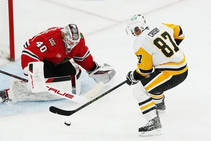 Pittsburgh assumiu o controle com um primeiro período explosivo, derrotando o goleiro Spencer Knight do Chicago com quatro de seus primeiros sete arremessos nas 12h03 iniciais.