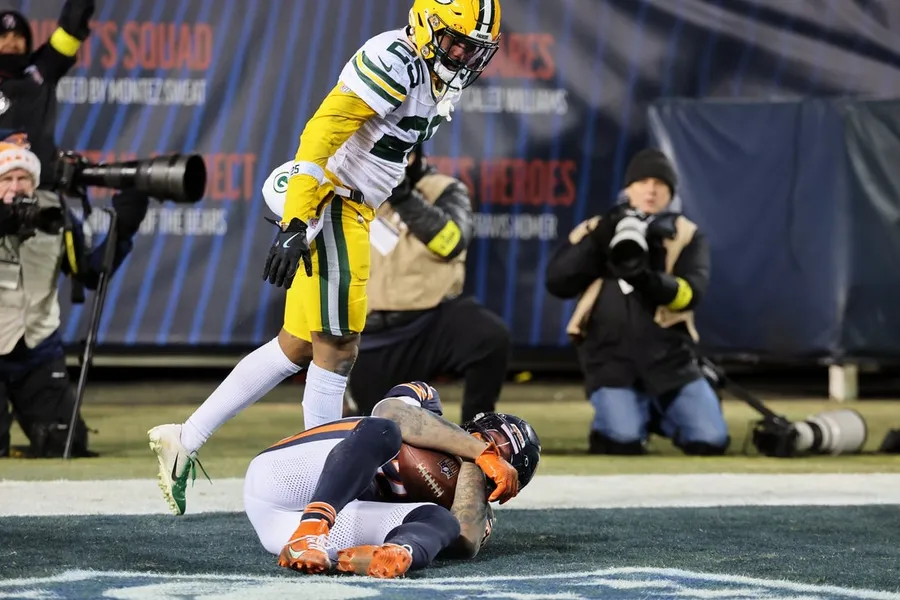 Romeo Doubs não conseguiu conter o chute lateral e os Bears se recuperaram para uma primeira descida aos 47. Williams então acertou um Walker aberto no canto direito da finish zone.