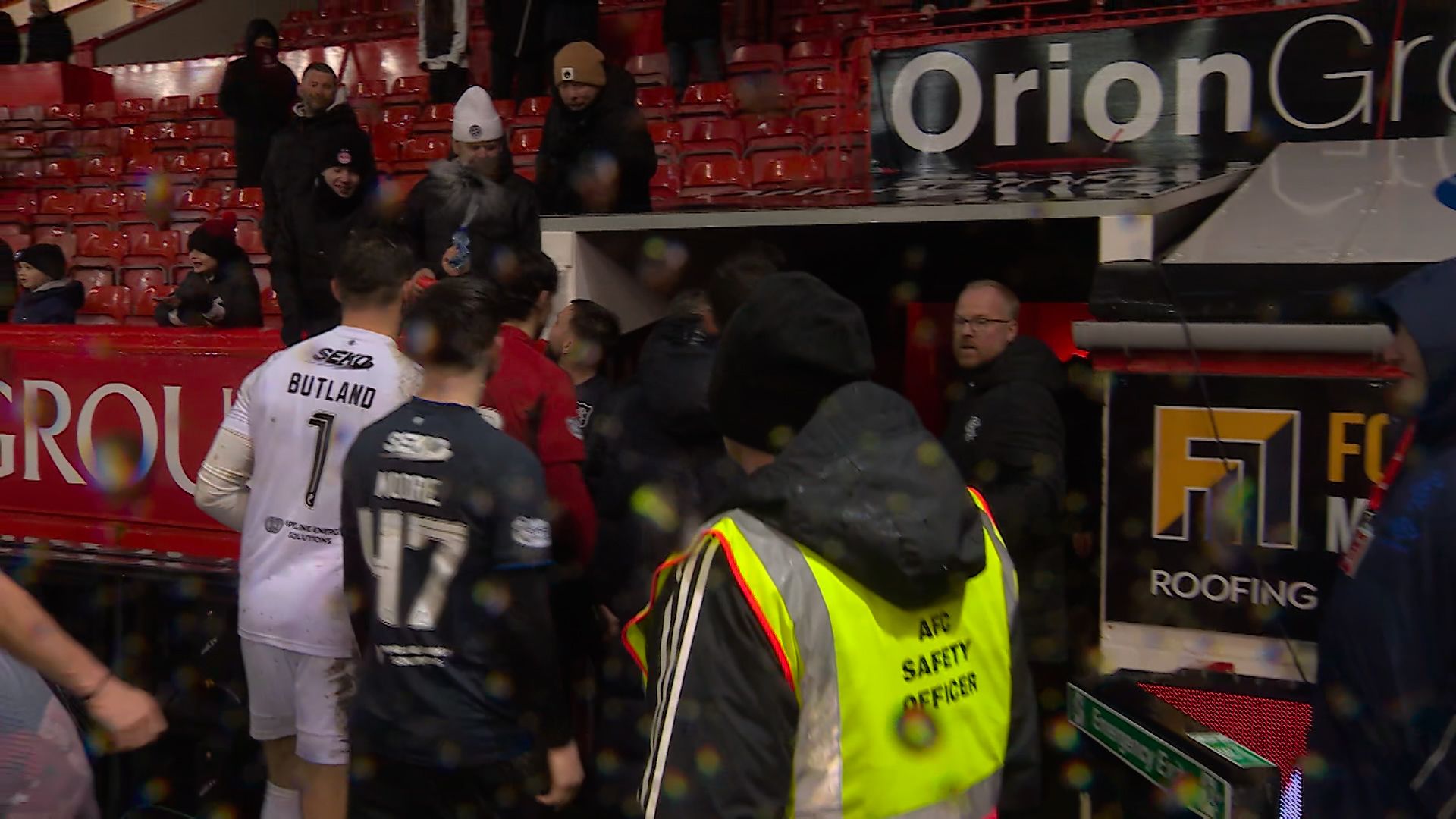 Nicolas Raskin esguichou água em um torcedor do Aberdeen após a vitória do Rangers por 2 a 0 sobre o Pittodrie, no domingo.