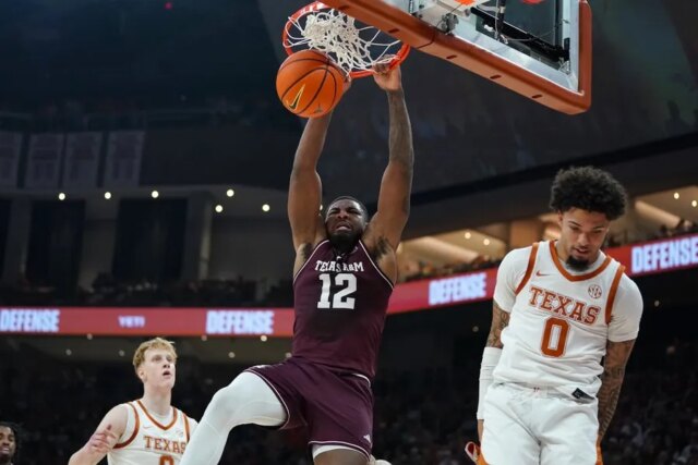 A disputa estava empatada em 29 no intervalo, antes que os Aggies (14-4, 4-1 SEC) subissem para a frente por 10 pontos no início do segundo tempo. O Texas chegou a 68-62 quando Jordan Pope converteu uma jogada de quatro pontos faltando 4:37 para o fim.