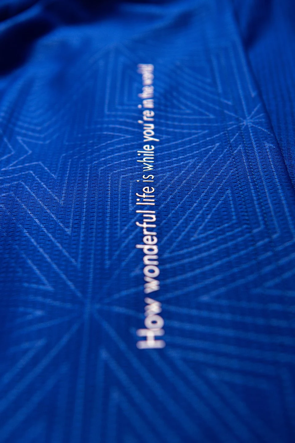 A gola e os punhos trazem detalhes adicionais de estrelas, enquanto o reverso traz em relevo a letra de uma de suas canções mais icônicas, “Sua Canção”.