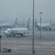 Aeronaves estão estacionadas no aeroporto IGI, em Nova Delhi, em meio a denso nevoeiro | Crédito da foto: RV Moorthy