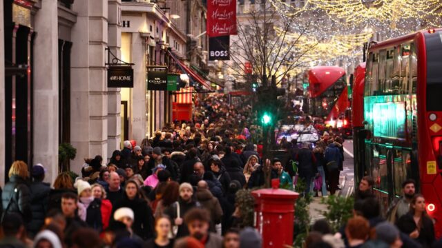 Os compradores passam pelas lojas na Regent Road no último dia da semana antes do Natal em Londres, em 22 de dezembro de 2023.