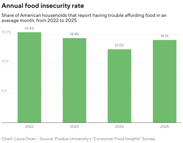Aproximadamente 14% das famílias dos EUA relataram insegurança alimentar, em média, entre janeiro e outubro, acima dos 12,5% em 2024, de acordo com o último dados do Centro de Análise de Demanda Alimentar e Sustentabilidade da Purdue.