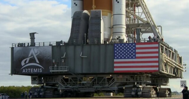 Centímetro por centímetro, o foguete lunar Artemis II da NASA avançou pesadamente ao longo de seu trajeto de seis quilômetros do Edifício de Montagem de Veículos até a plataforma de lançamento 39-B. Mark Strassmann está no Centro Espacial Kennedy, na Flórida, com mais.