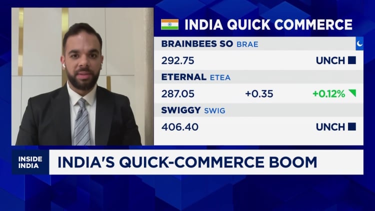 “O mercado de comércio rápido da Índia representa atualmente 10% de seu mercado de comércio eletrônico, mas no médio e longo prazo poderá representar 40%-50%”, disse Karan Taurani, vice-presidente executivo da corretora indiana Elara Capital, ao Inside India da CNBC na semana passada.