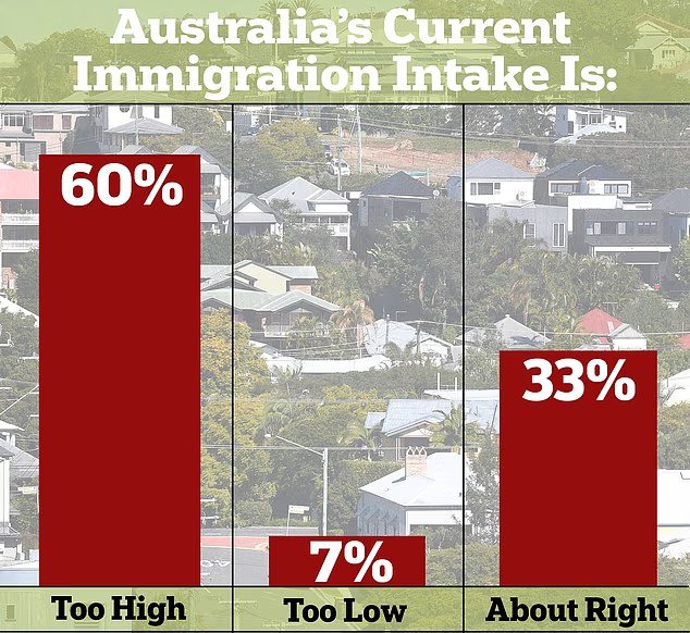 Espantosos 60 por cento dos entrevistados dizem que os níveis de imigração da Austrália são demasiado elevados, enquanto apenas 7 por cento acreditam que são demasiado baixos.
