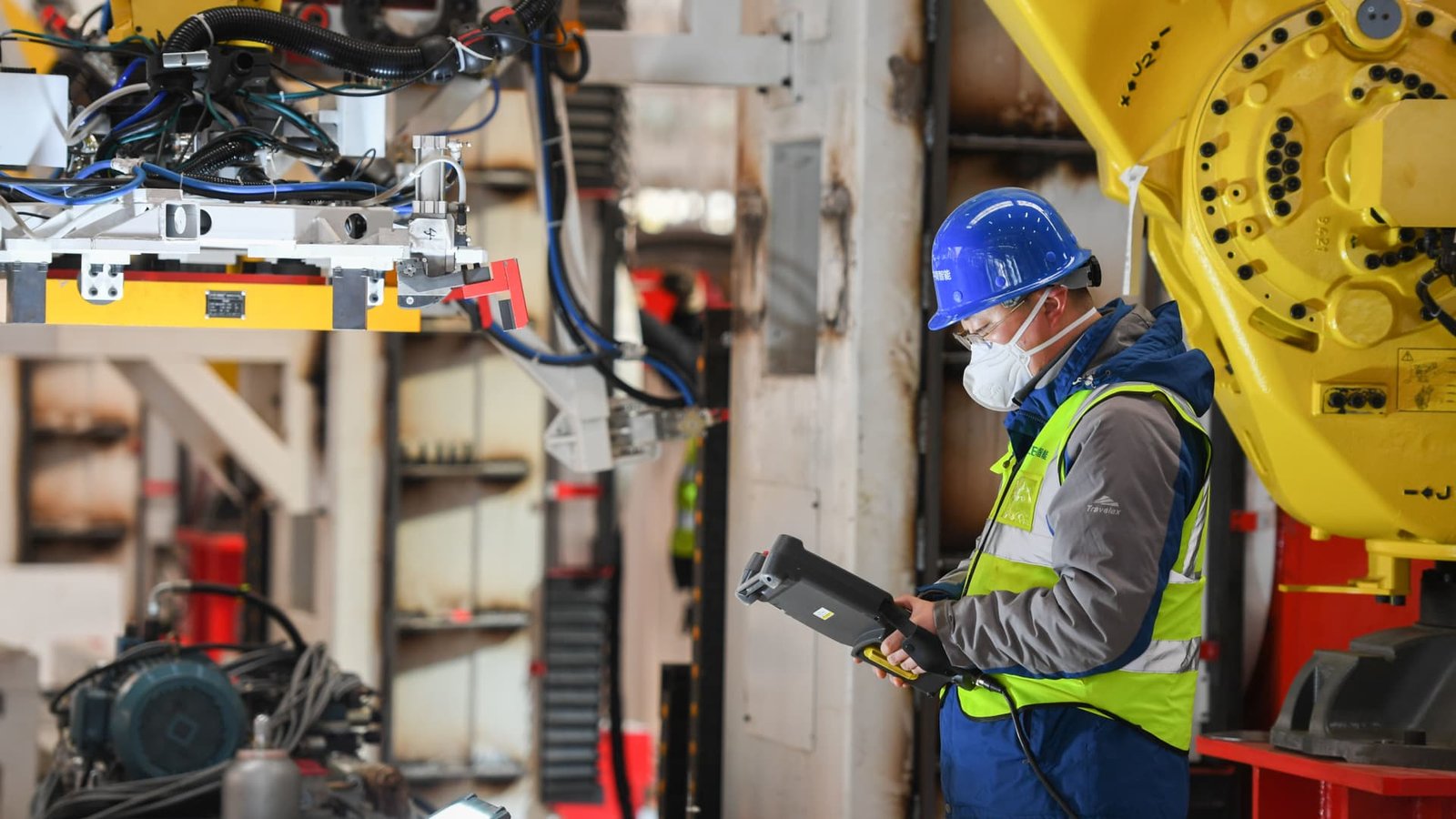 Um trabalhador depura um robô em uma fábrica da Sany Heavy Trade em Changsha, província de Hunan, centro da China, em 20 de fevereiro de 2020.
