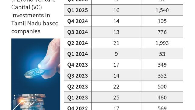 Para o ano de 2025, as empresas de PE-VC investiram 3.513 milhões de dólares em 61 negócios em empresas sediadas em Tamil Nadu, um aumento de 20%. Em 2024, foram 57 negócios com investimento de US$ 2.927, de acordo com dados compartilhados pela Enterprise Intelligence, serviço de pesquisa focado em finanças, transações e avaliações de empresas privadas. Os dados incluem investimentos do tipo capital de risco, mas excluem investimentos de PE no setor imobiliário.