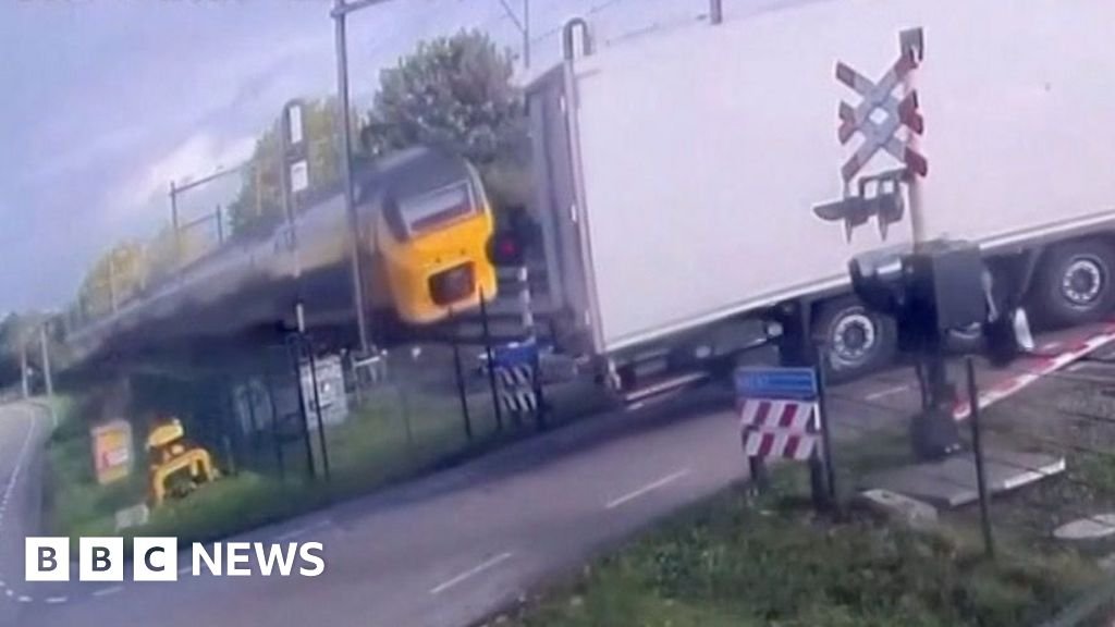 Imagens de CCTV mostram o momento dramático em que um trem colidiu com um caminhão em uma passagem de nível na Holanda.