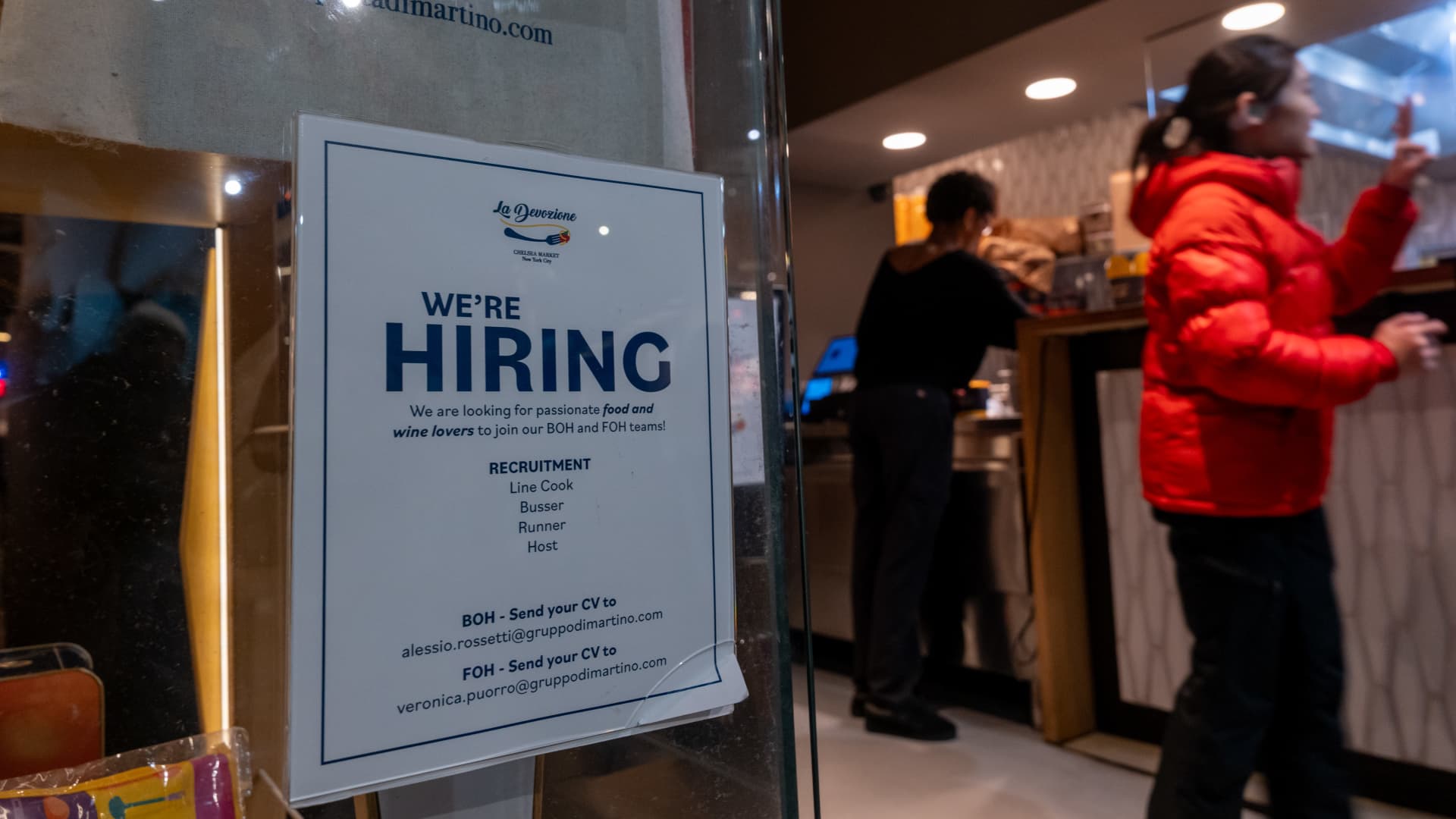 Um restaurante exibe uma placa de ‘contratação’ em sua vitrine em Manhattan, em 16 de dezembro de 2025, na cidade de Nova York.