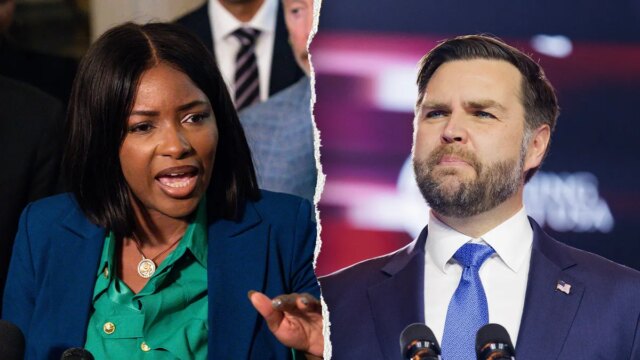 Rep. Jasmine Crockett e vice-presidente JD Vance. (Kayla Bartkowski/Bloomberg through Getty Photographs; Caylo Seals/Getty Photographs)