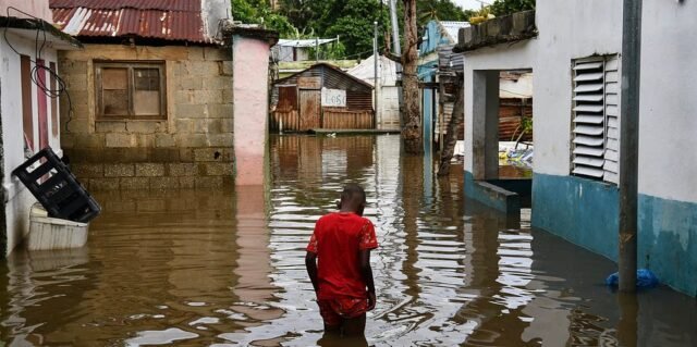 TOPSHOT - Um homem caminha por uma rua inundada após a passagem da tempestade tropical Melissa antes de se tornar um furacão no bairro Las Cucarachas em Santo Domingo, República Dominicana, em 28 de outubro de 2025. (Foto de Danny Polanco / AFP) (Foto de DANNY POLANCO/AFP via Getty Images)
