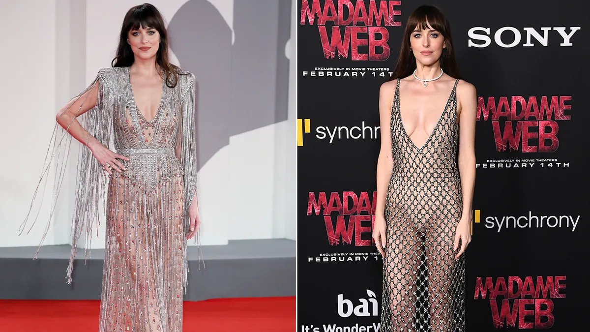 O amor de Johnson pelo vestido nu remonta a 2021, quando ela chegou ao Pageant de Cinema de Veneza com um vestido Gucci transparente personalizado cheio de joias e franjas prateadas. Ela então fez barulho quando usou um vestido preto transparente com desenhos de teias de aranha na estreia de “Madame Net” em 2024.