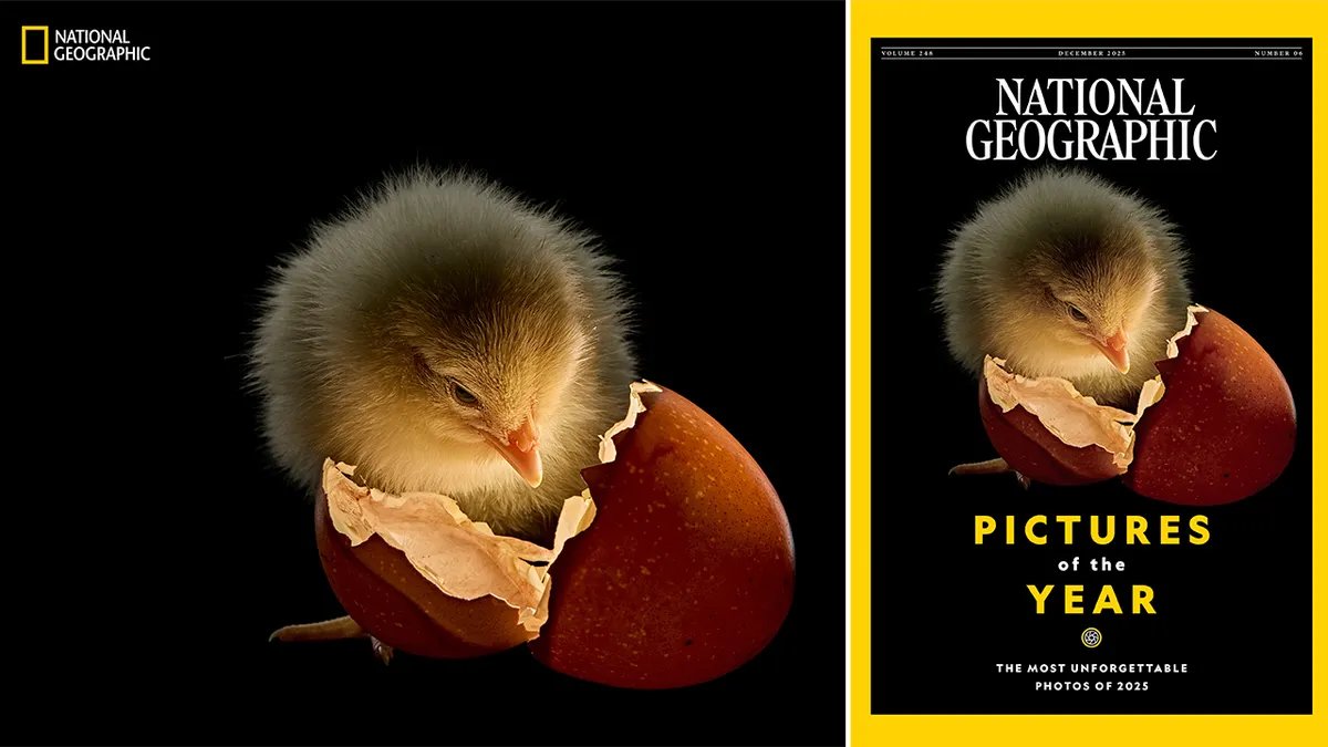 A capa da edição de dezembro de 2025 da Nationwide Geographic (à direita) destaca as Imagens do Ano anuais. Durante anos, o fotógrafo Anand Varma tentou documentar quando uma gema de ovo ainda pode ser vista, mas uma forma de pássaro emergiu claramente. Ele fez experiências incubando embriões em conchas artificiais antes de finalmente capturar a transformação aos 12 dias de idade. Varma criou separadamente alguns embriões de pintinhos, que doou para pessoas da comunidade. (Anand Varma; Nationwide Geographic)