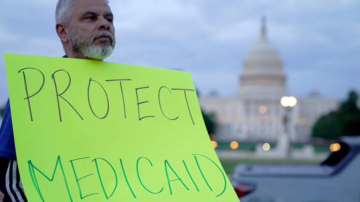 Um manifestante segura uma placa para proteger o Medicaid e ilumina o Capitólio em meio a um confronto orçamentário, em 7 de maio de 2025 em Washington, DC. (Leigh Vogel/Getty Pictures para cuidar de todas as gerações)