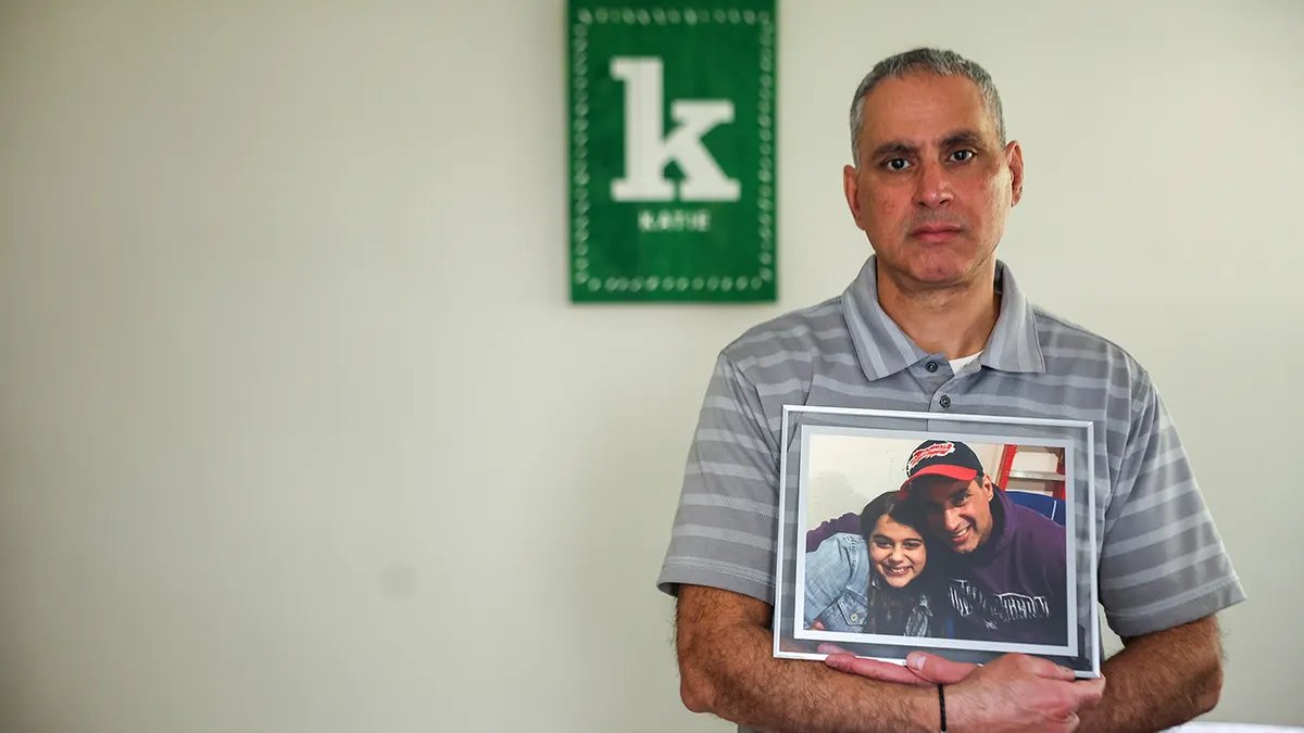 Joe Abraham segura uma foto sua com Katie Abraham, de 20 anos, na casa de sua família em Glenview, Illinois, em 10 de setembro de 2025. (Stacey Wescott/Chicago Tribune/Tribune Information Service through Getty Pictures)