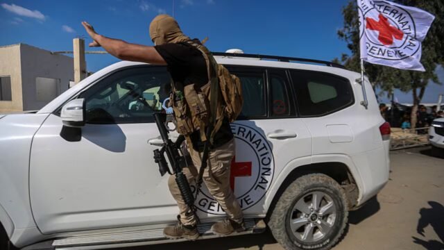 Treze reféns israelenses libertados pelas Brigadas Al-Qassam são entregues às equipes do Comitê Internacional da Cruz Vermelha (CICV) em Deir al-Balah, Gaza. Foto / Imagens Getty