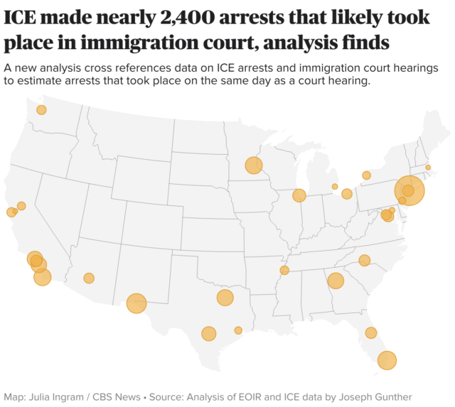 Gunther identificou quase 2.400 prisões do ICE provavelmente feitas em tribunais de imigração em todo o país, um whole que, segundo ele, ainda pode ser subestimado. A análise preenche uma lacuna deixada pela falta de relatórios do DHS sobre quantas detenções o ICE realizou nos tribunais ou nas suas imediações.