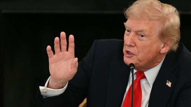 O presidente dos EUA, Donald Trump, fala durante uma mesa redonda sobre “Antifa”, um movimento antifascista que ele designou como uma “organização terrorista” doméstica no Salão de Jantar do Estado da Casa Branca em Washington, DC, em 8 de outubro de 2025.