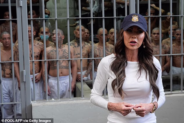 A secretária de Segurança Interna dos EUA, Kristi Noem, fala durante uma visita ao Centro de Confinamento Terrorista (CECOT), enquanto prisioneiros olham de uma cela, em Tecoluca, El Salvador, em 26 de março de 2025