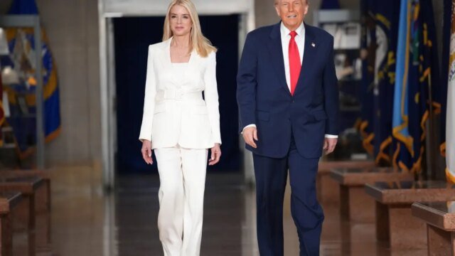 O presidente Donald Trump caminha com a procuradora-geral Pam Bondi durante uma visita ao Departamento de Justiça em 14 de março de 2025 em Washington, DC (Foto de Andrew Harnik/Getty Photos) (Andrew Harnik/Imagens Getty)