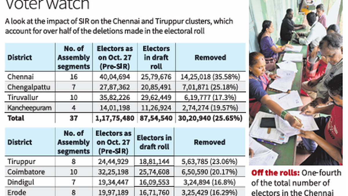 Mais de metade do complete de eleitores removidos do projecto integrado de cadernos eleitorais na sequência do exercício de Revisão Intensiva Especial (SIR) em Tamil Nadu pertenciam a apenas dois grupos compreendendo oito distritos – quatro no norte do Estado e quatro na região oeste (com um na região sudoeste).