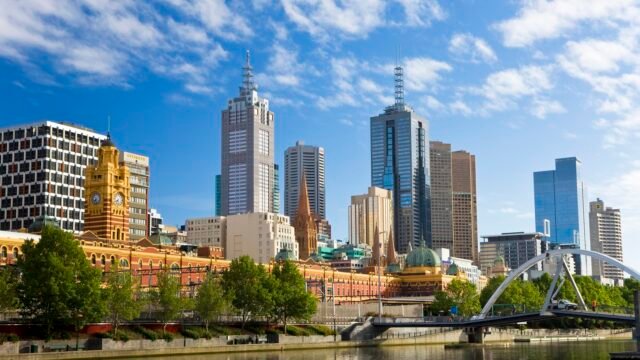 Austrália, Victoria, Melbourne, edifícios na margem do rio Yarra